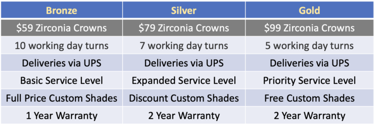 Each level utilizes high quality, esthetic multi-layer zirconia to create the most affordable crowns while keeping turnaround times consistent. Choose the turnaround time and price level that works best for your schedule and budget.